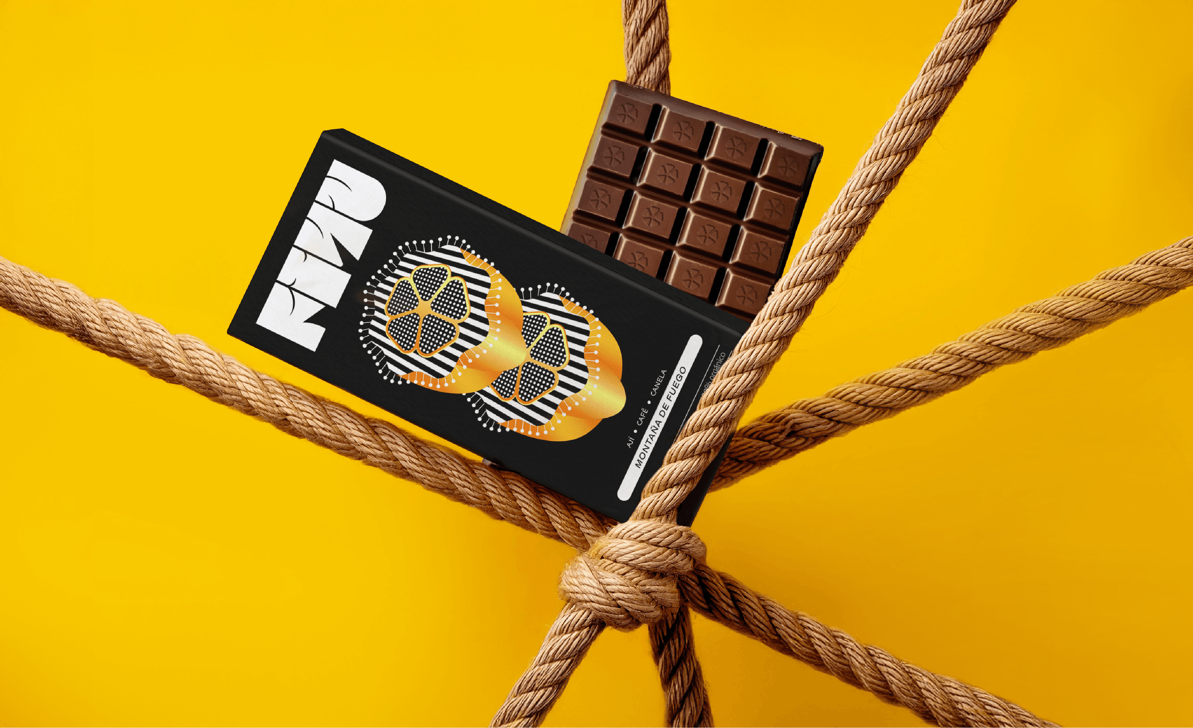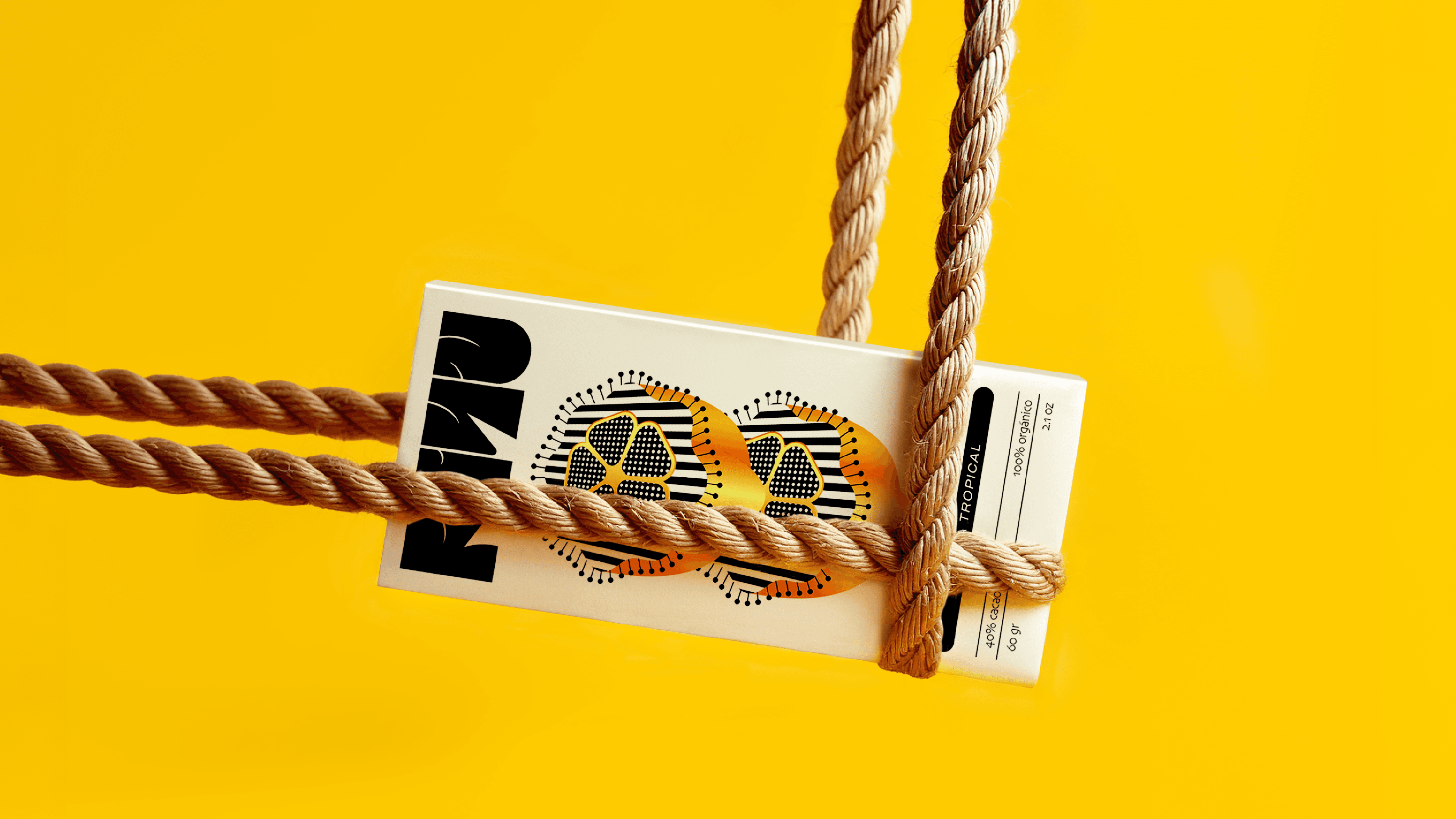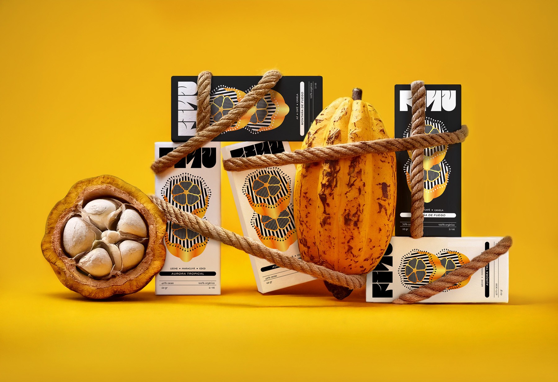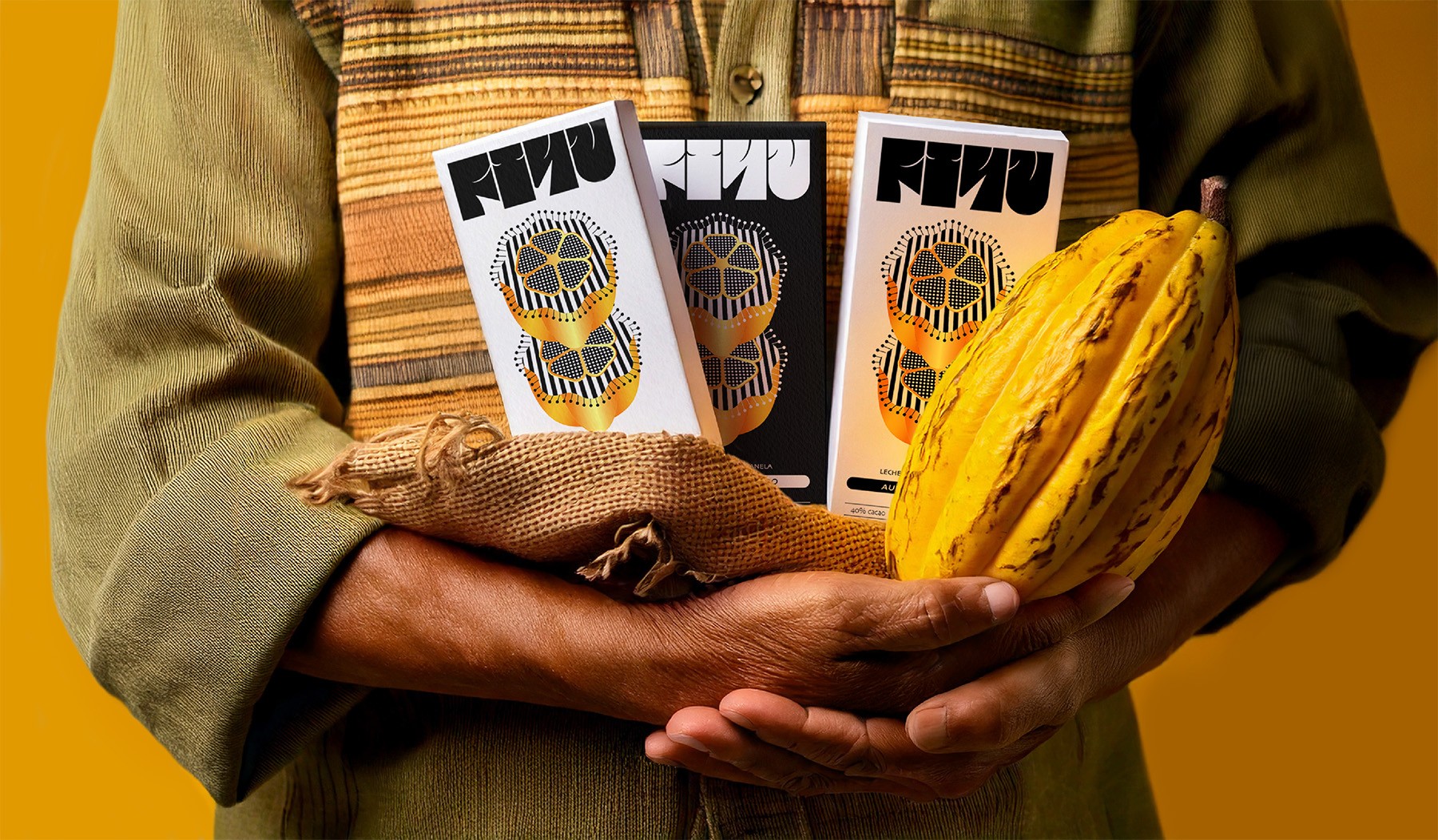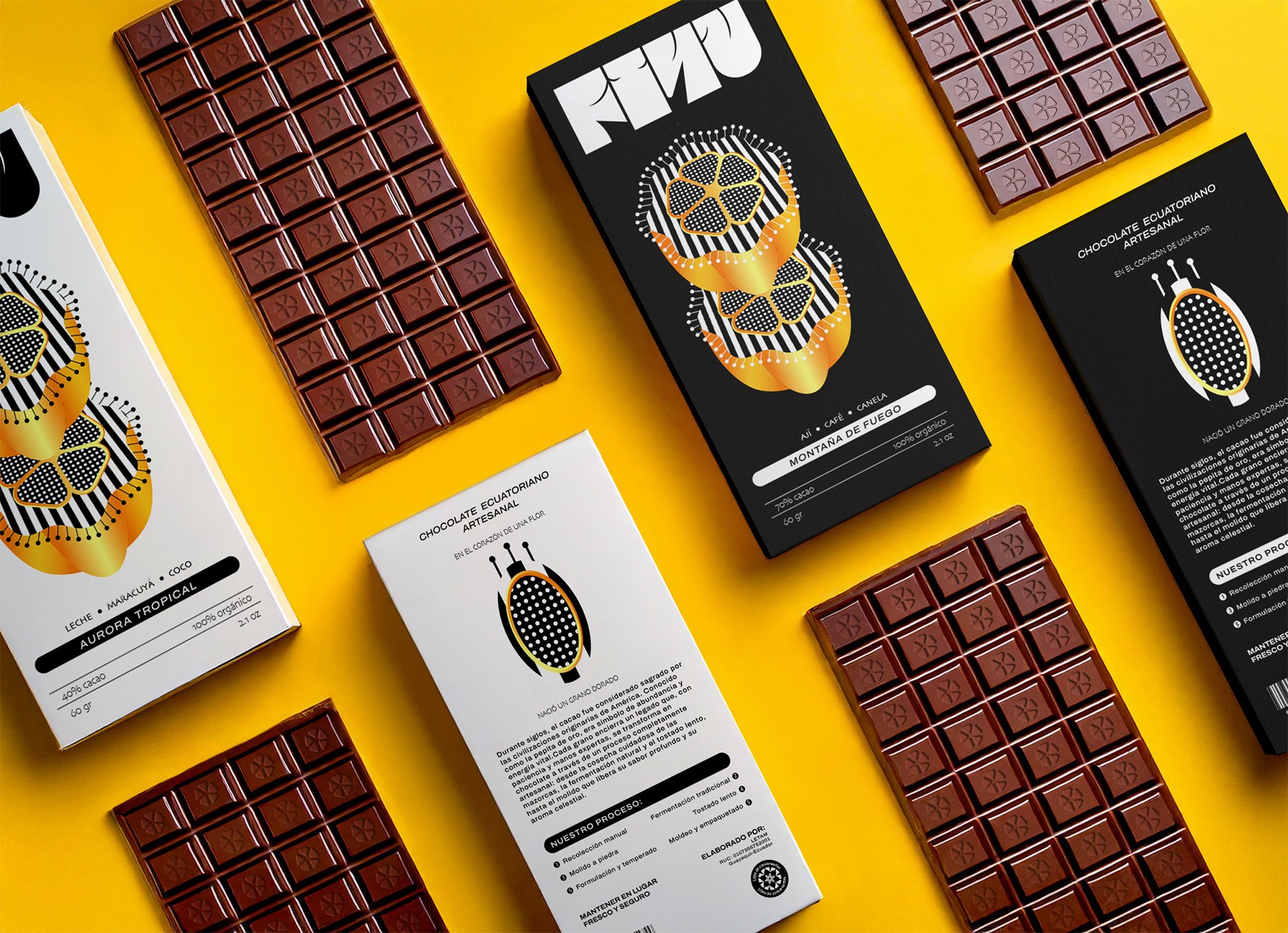 This rarity inspires the packaging illustration, where a single flower emerges among cacao beans, symbolizing the magic of this cycle.The yellow hue evokes the vibrant color of ripe cacao, while the golden gradients pay tribute to its nickname, “golden nugget.”
