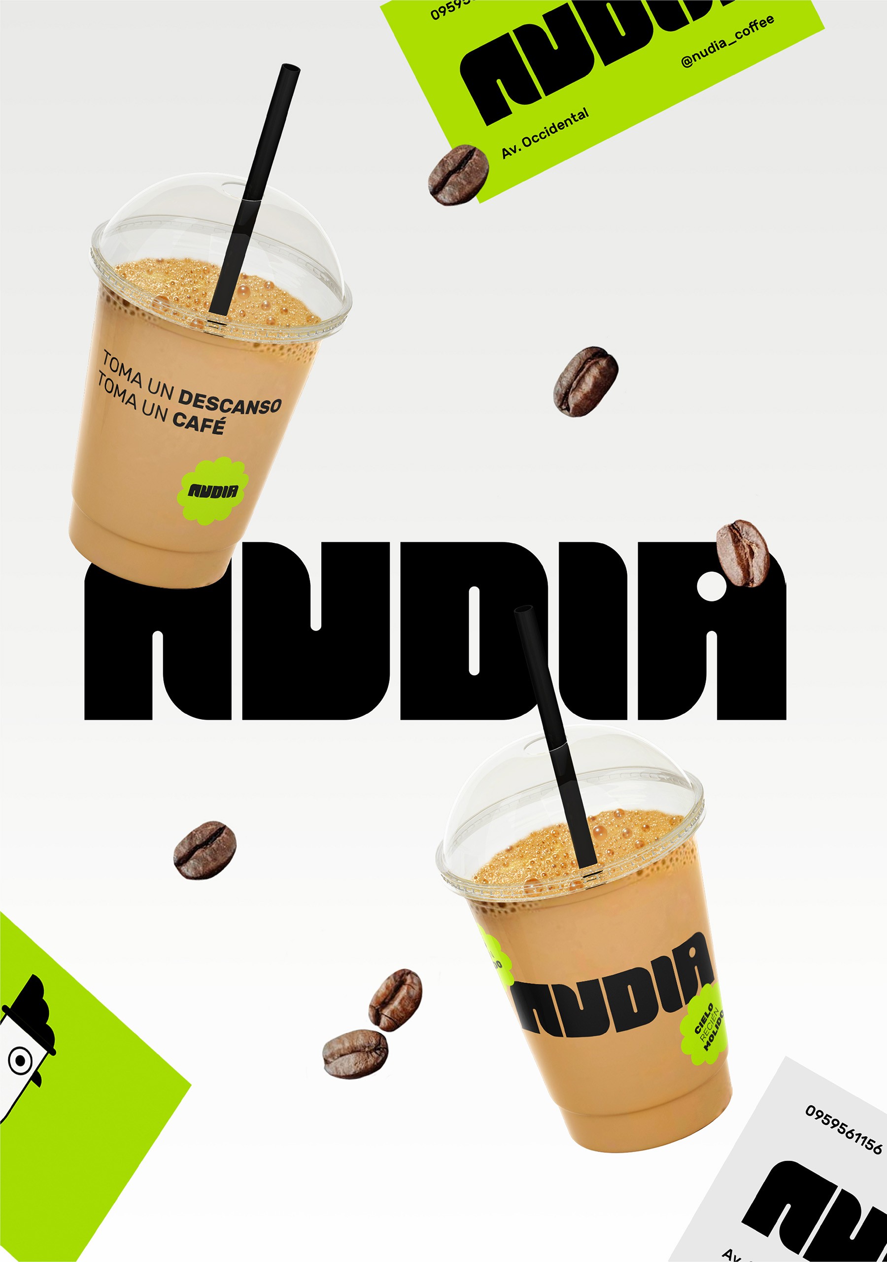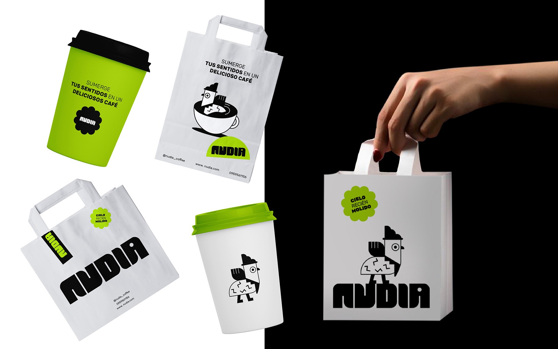The visual identity is built around a key character: birds, which represent the natural essence that envelops the café. The primary color, a vibrant neon green, reflects youthful energy and is inspired by the surrounding tones, creating a striking contrast within a minimalist space. The logo’s typography, with rounded terminals, reinforces the brand’s organic and approachable identity, forming a visual system that balances functionality with emotion.